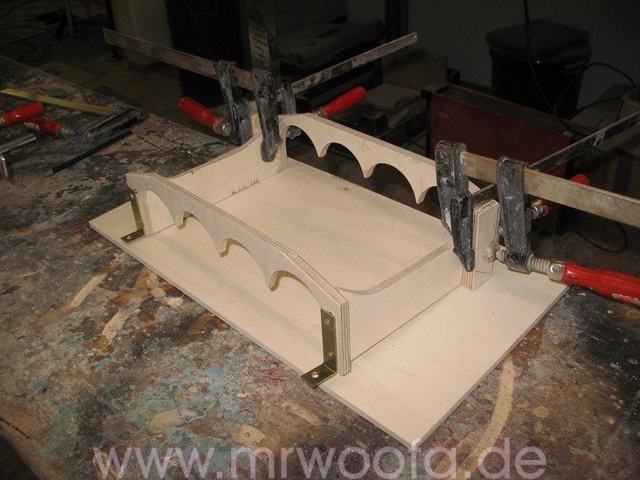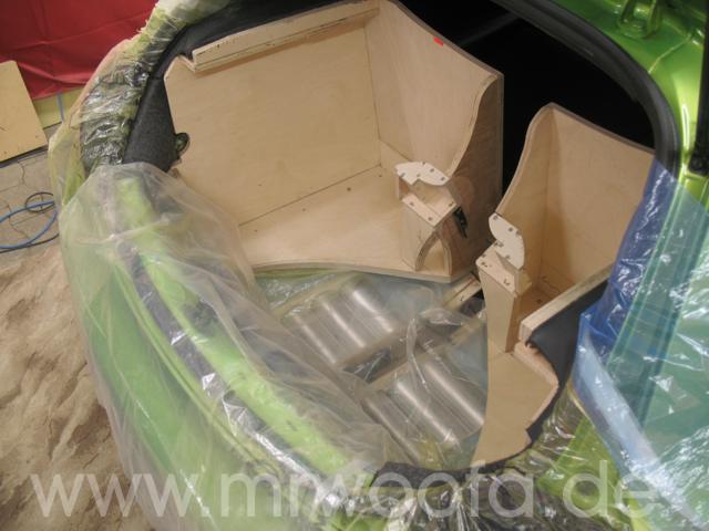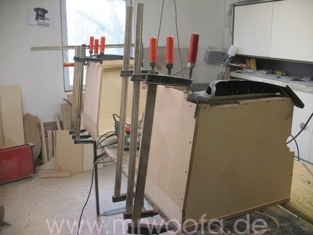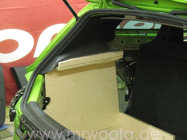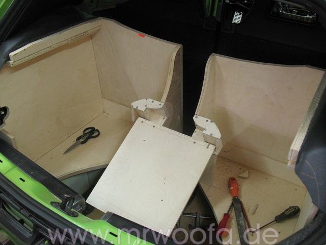Rückwand und Seiten werden auch aus MPX gebaut. Alle Platten werden geleimt und verschraubt. Damit die Kisten später wie aus einem Guss an den Kofferraumseiten abschließen werden die seitlichen Verkleidungen dafür genutzt und mit der Stichsäge entsprechend angepasst. Da die Kisten bis unter die seitlichen vorstehenden Bleche gehen um viel Volumen nutzen zu können, muss hier genügend Platz sein um sie später zur Mitte hin vorzuziehen.