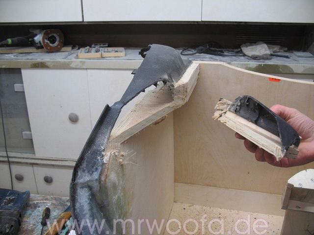 Hier wird die Rückwand eingesetzt. Der Absatz unten muss sein, wenn die Rückenlehnen ihren Drehpunkt weiter oben haben und somit unten 'ausscheren'. An der Seite sieht man sehr gut, wie und wo die originale Verkleidung mit dem Gehäuse verbunden ist.