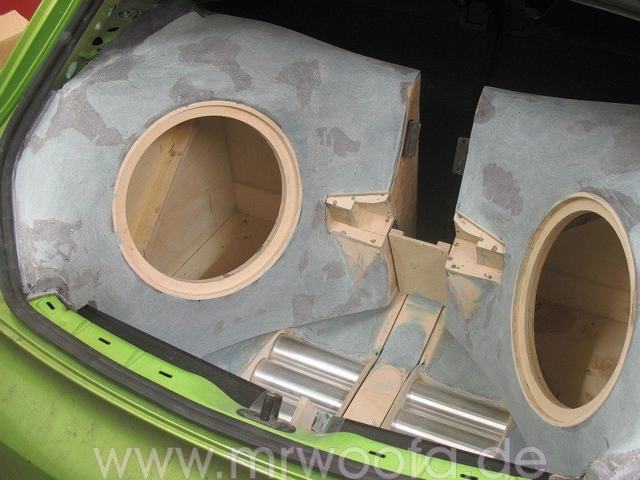 Während die anderen Umbauten im Scirocco zu 90% aus klanglicher Sicht erfolgten, ist der Aufwand im Kofferraum fast komplett der Optik zuzuschreiben. Eine solide gebaute Subwooferkiste sowie Stromversorgung und Endstufen in einem doppelten Boden hätten es klanglich genauso getan. Aber das wäre ja zu einfach – und zu unauffällig...