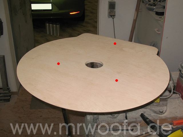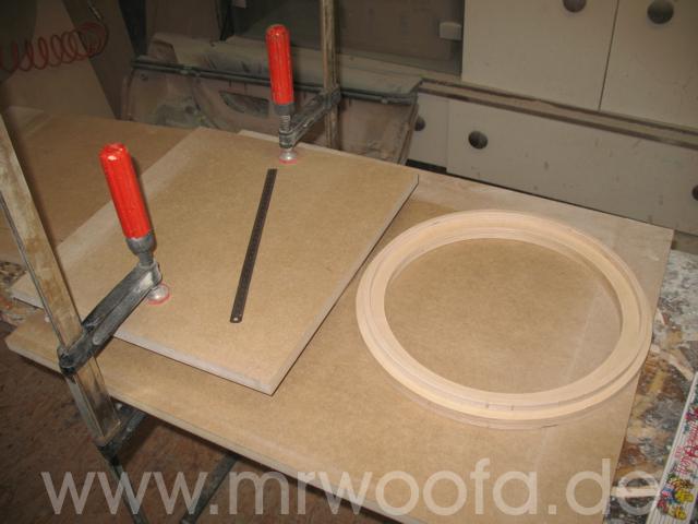 Mittels Oberfräse und Fräszirkel werden jetzt Einbauringe für die Subwoofer hergestellt. Um einen sauberen und kraftschlüssigen Verbund zum späteren GFK zu bekommen, ist der untere Ring etwas größer im Durchmesser als der obere, hier kann später das Formvlies aufgetackert werden. Immer so bauen, das die Auflagefläche der Subwoofer gerade ist, nicht mit Formvlies o.ä. überspannen das bekommt man nicht gerade und der Korb kann sich verziehen, brechen oder ist später nicht luftdicht verbunden.