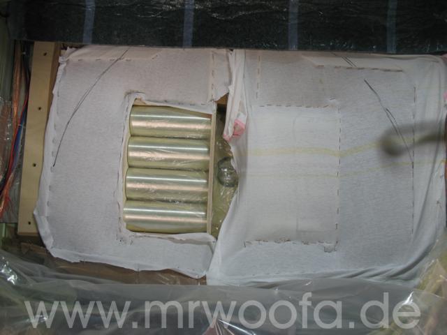 Um die Form an den Rest anzupassen, habe ich mit Stoff (Akustikstoff geht hervorragend, T-Shirt funktioniert aber auch) die Form gemacht, an den Seiten ist der Stoff an die Leisten für die Gehäuse mit Tackernadeln und auf den abgeklebten Endstufen mit Heißkleber befestigt. Rundrum und unter den Haltern ist natürlich wieder alles mit Folie abgeklebt damit nichts mit Harz versaut wird. Zur Form sei noch gesagt, das ich hinten 2 dünne Leisten eingebaut habe, dahinter bildet dich eine Art Kabelkanal durch die die ganzen Kabel in die Mulde laufen werden.