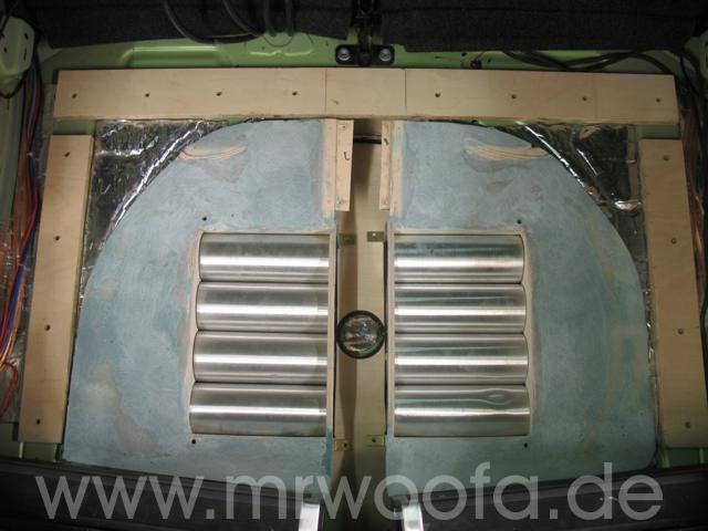 Die so verschraubten Platten werden an der vorgesehenen Position auf den vorher mit Aceton o.ä. gereinigten Kofferraumboden aufgesetzt und gleichmäßig beschwert. Mit dieser Technik kann man quasi jede Art von Gehäusen und Kisten fest und sicher mit dem Kofferraumboden verbinden.