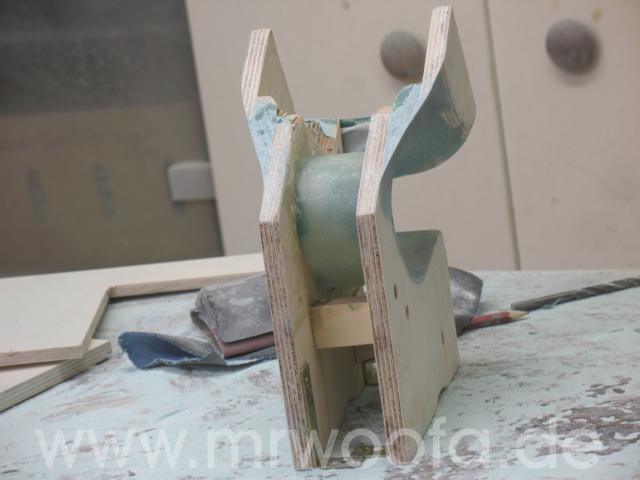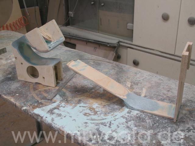 Die folgenden Arbeitsgänge mit Glasfaser verstärken, von hinten verstärken, spachteln und schleifen sind die gleichen wie bei den Gehäusen.