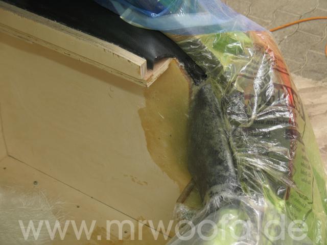 Jetzt wird der Teppich mit Harz getränkt und mittels Glasfasermatten mit dem Gehäuse verbunden. Dies funktioniert im Gegensatz zu den Kunststoffteilen hervorragend, da sich das Harz prima mit dem Teppich verbindet.