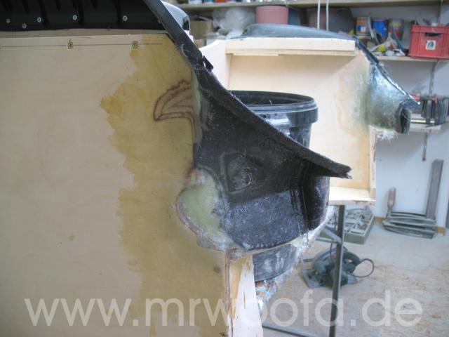 Wenn alles ausgehärtet ist, werden überschüssige Glasfaserreste mit dem Flex und grober Schleifscheibe entfernt, sowie die ersten groben Unebenheiten beseitigt. Dann wird alles eingebaut um zu gucken ob es paßt, noch können Änderungen wenn sich z.B. etwas verzogen haben sollte noch gut korrigiert werden. Paßt alles, wird zum erreichen einer schönen Oberfläche mit einem flexiblen Kunststoffrakel Glasfaserspachtel aufgetragen. Wer hier gut spachtelt, braucht später weniger schleifen.