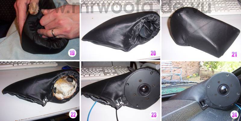 22. Jetzt werden die Löcher für die Lüftungsschlitze und den Hochtöner freigeschnitten. Die Tackernadeln werden vor dem Einbau des HTs wieder entfernt, diese haben nur den Stoff gehalten bis der Kleber trocken war.