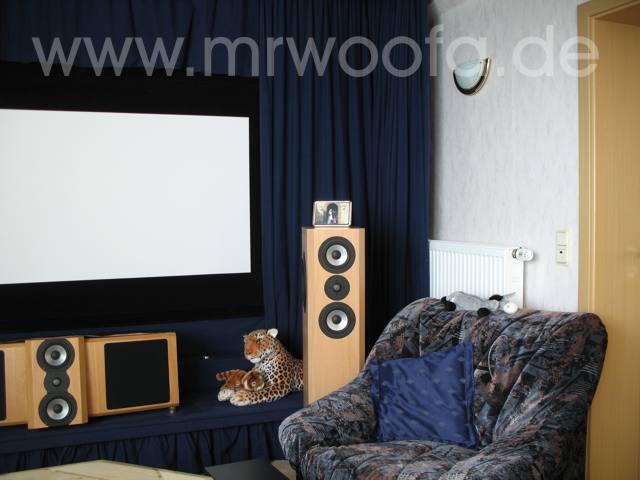 Bild: Der Barco macht ein fantastisches Bild, natürliche Farben, echtes Schwarz, halt das was man bei einem Röhrenprojektor erwartet. Angesteuert wird er über einen HTPC, mit 1440x1152 Pixel Auflösung bei 50Hz. Er würde zwar auch 100Hz noch schaffen, aber die Schärfe ist bei 50Hz einfach besser. Flackern sieht man nur bei hellen Hintergünden in Windows. Auch bei einem gelegentlichen Spielchen auf 1280x720 @75Hz macht sich die große Leinwand sehr gut :) Durch die Vorhänge an den Seiten und die Stoffbehängung der Decke wird das von der Leinwand in den Raum zurückgeworfene Licht absorbiert, und kann somit nicht wieder auf die Leinwand zurückgeworfen werden, dies äußert sich in einem deutlich verbesserten Kontrast.