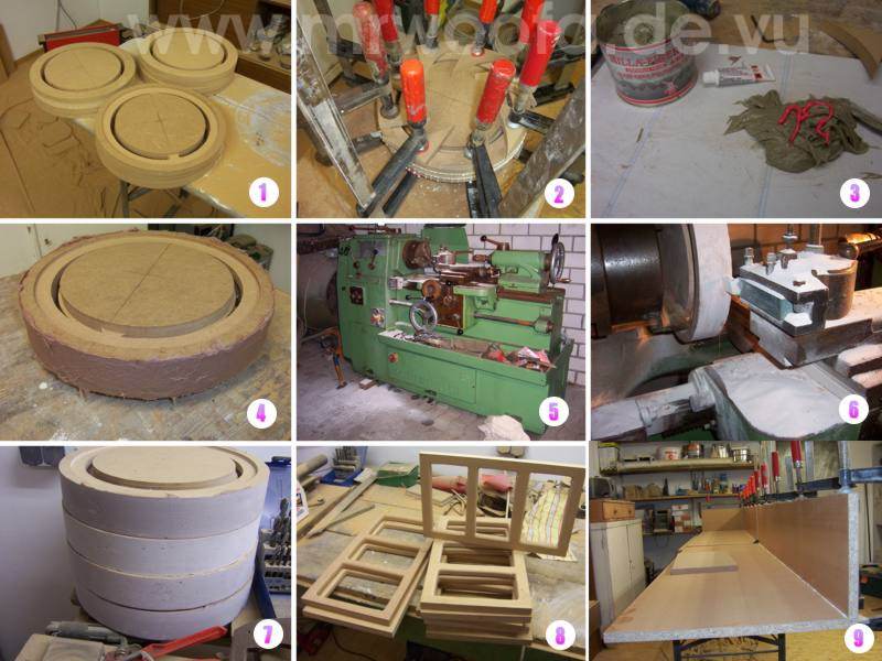 2. die Ringe werden mittels eines Nagels, der durch die Löcher für den Fräszirkelmittelpunkt gesteck wird, fixiert und verleimt.