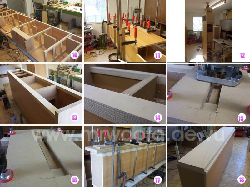 9. nun gehts dabei die Kisten zu verleimen, die flierte Spanplatte erfordert den Einsatz von Montagekleber, Holzleim hält auf der glatten Oberfläche nicht!