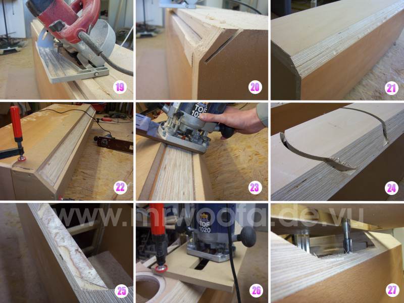 22. Nun habe ich mir um die Fasen glatt zu fräsen, eine Vorrichtung gebaut. 2 lange gerade MDF-Platten werden über Eck auf die Box gespannt, ausgerichtet und an den Enden verschraubt.