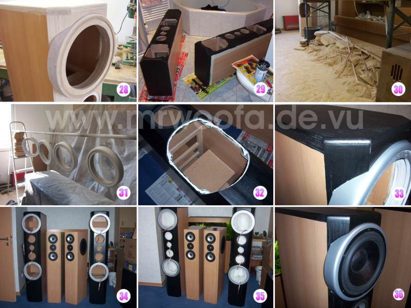 35. Zur Dämpfung habe ich pro Box 15 Matten eingefüllt, da wird aber noch mit experimentiert. Hinter der Weichenkammer ist frei, hinter der Mitteltonkammer ist zuur Bekämpfung stehdner Wellen ordntlich gestopft, dort finden insgesamt 7 Matten Platz, 6 Stück 2-fach gefaltet hochkant und eine quer drüber. Der Rest wird gleichmäßig im gehäuse verteilt. Die Mitteltonkammer bekommt 1,5 Matten.