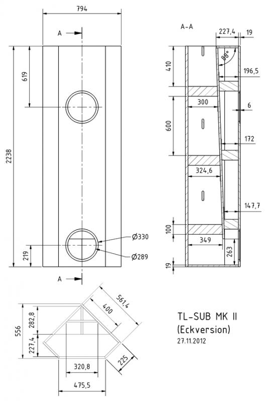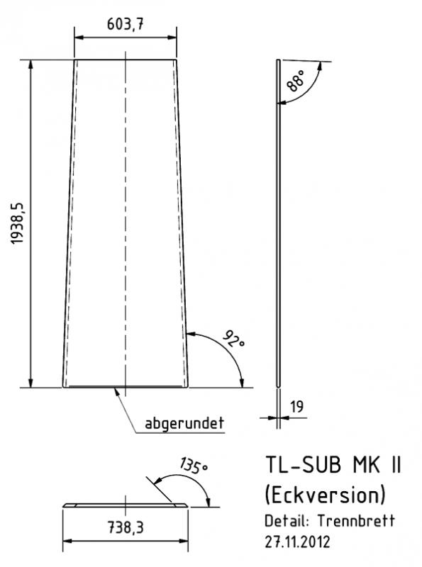 Der vorgegebene Bauvorschlag war mit einem rechteckigen Gehäuse - das gefiel mir nicht. Also rechnete ich ein Weilchen rum und stellte fest, das der neue TL-Sub bis auf den cm² den gleichen Innenquerschnitt hat wie der alte. lediglich der Innenaufbau mit dem schrägen Trennbrett und der unterschiedlichen Positionierung der Chassis unterscheidet sich dann von der originalen 5-Eck Version. Mittlerweile ist meine Version bei den 'Neuen Bauvorschlägen und Modifikationen' im Visaton-Forum angekommen und es gibt eine offizielle Bauzeichnung dafür die ich euch nicht vorenthalten will. EInen Dicken Dank an dieser Stelle nochmals an die Firma VISATON!