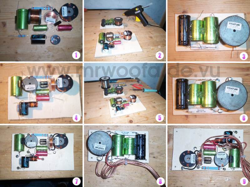 8+9. Jetzt Löchen an den Ecken der Brettchen bohren zur späteren Befestigung. Dann werden die Zuleitungen zum Anschlußterminal und den LS-Chassis angelötet. Länge vorher grob ausmessen bzw. anhalten, lieber 30cm länger als 1cm zu kurz. Man sollte die Chassis mit eingelöteten Kabeln noch herausbekommen... Ich klemme die Kabel unter die Heftzwecken, dann mit VIEL Zinn verlöten (und heiß genug!)