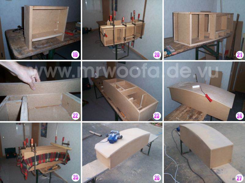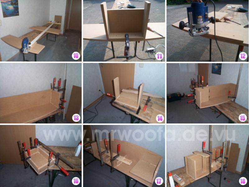 11. Die Stücke für die Ober und Unterseite des Mitteltongehäuses richte ich mit den Seiten- und der Rückwand an der Rundung aus, schraube sie mit Spax am Brett fest. Später die Löcher mit Leim oder Heißkleber verschließen!