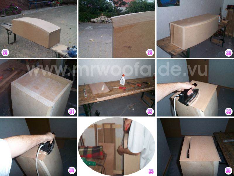 33. Wenn der Leim (Ponal Express) nach ca. 30min. trocken und durchsichtig ist, kann das Furnier aufgebügelt werden. Hierzu das Eisen (kein Dampf!) auf ‚Volle Pulle’ stellen und mit sanften, bestimmenden Druck von der Mitte her anfangen und in ca. 5-10cm breiten Streifen zum Rand hin arbeiten. Eventuelle Beulen sanft wegbügeln, in irgendeine Richtung gehen die schon weg.