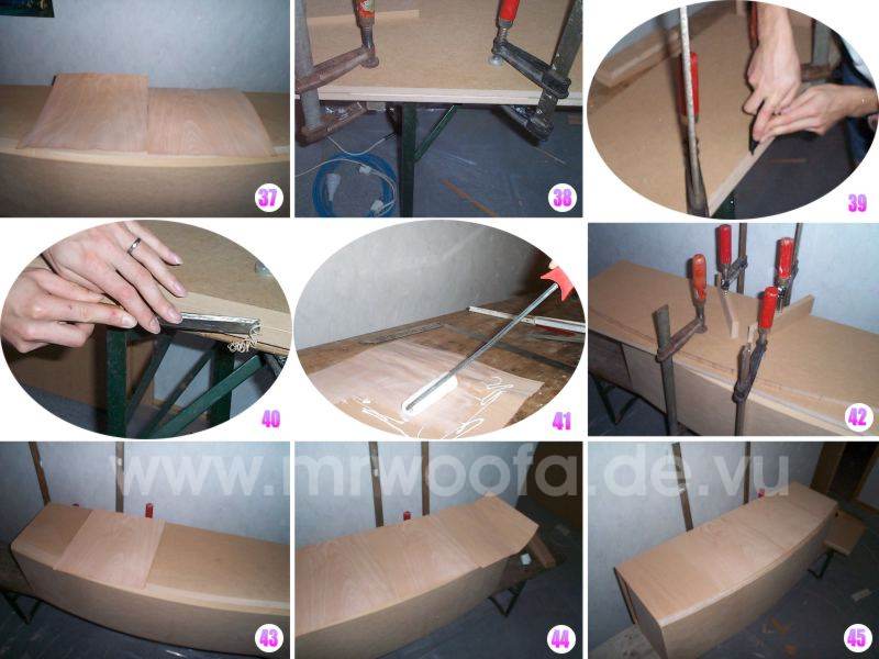 23. 2 Stunden später... ;) jetzt die gesamten Kontaktflächen zum Deckel FETT mit Leim bestreichen und die erste dünne MDF-Schicht draufpappen, Decke drauf und pressen (siehe 25).
