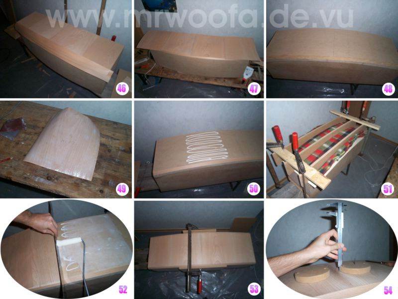 92. Damit die Rahmen eine leichte Rundung bekommen, habe ich einem Tip nach (Dank an Peter! ) dünne Furnierstreifen passend geschnitten. Der kürzeste kommt nach unten, der längste nach oben, dann gibt es eine sehr gleichmäßige Rundung. Ich habe alles auf einmal verleimt, ganz genau brauchts nicht sein, das Furnier kann ruhig etwas zum Rand hin überstehen.