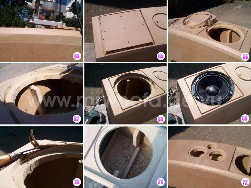 72. Dann die Ausschnitte für Mittel- und Hochtöner mit der Stichsäge machen. Wieder den überstehenden Rand brechen und mit dem Stechbeitel nacharbeiten.