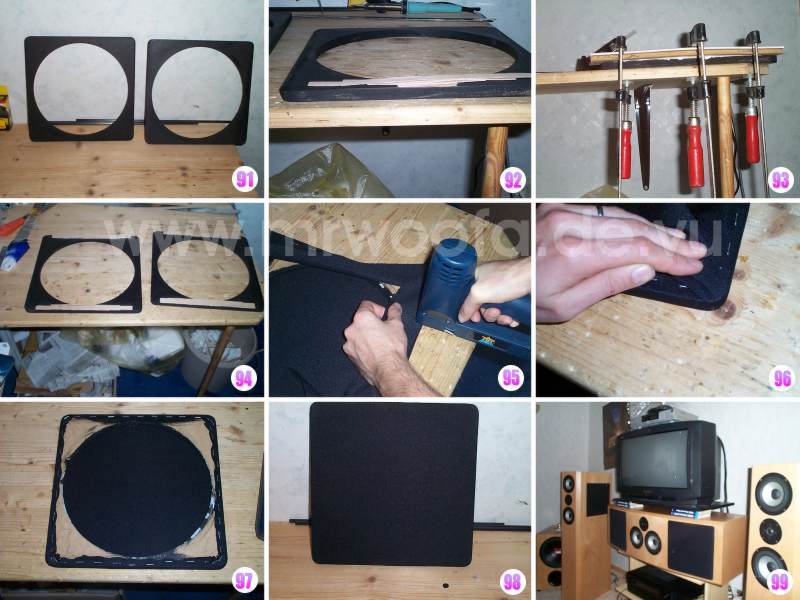95. Den Rahmen auf den passend (ca. 10-15cm größer) geschnittenen Akustikstoff legen, und erst eine Seite gerade antackern. Dann mit leichtem Zug (Foto) die gegenüberliegende Seite. Dann habe ich die Seiten mit der Rundung getackert, wieder unter mäßigem Zug.