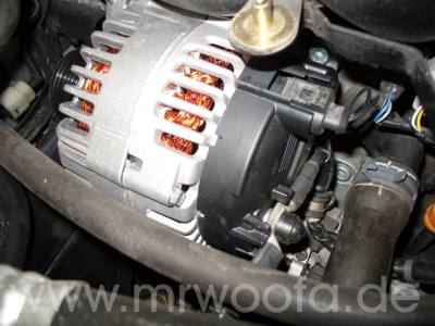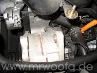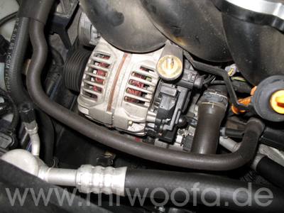 Für eine kräftige Anlage muß auch eine kräftige Stromversorgung her, nicht nur Kabel und Power-Caps, sondern auch ganz besonders die Lichtmaschine spielt hier eine große Rolle, denn sie ist der Erzeuger des gesamten Stroms den das Auto braucht, Batterien und Powercaps sind nur Stromspeicher. Bevor man also seinen Kofferraum mit Zusatzbatterien vollpackt und sich wundert, warum das Licht trotzdem noch bei jedem Baß flackert oder die Batterien irgendwann leer sind, sollte man eine größere Lichtmaschine verbauen. Min. 120A würde ich empfehlen, größer ist immer besser. Eine neue Lichtmaschine muß nicht teurer sein als eine (Zusatz)Batterie, sofern man denn mal bei ebay seine Augen offfen hält, und der Einbau ist bei den meisten Fahrzeugen kinderleicht. Ich will hier mal den Umbau in meinem Audi A3 Bj.99, 1,8 zeigen, dürfte für die meisten neueren Audi, Seat, Skoda und Volkswagenmodelle ähnlich sein.
