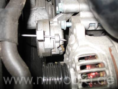 Im Nippel und an dem festen Teil rechts daneben sind 2 Löcher, hier kann man einen Nagel o.ä. durchstecken, um es zu arretieren. Man beachte die Kraft die das Teil hat, den Nagel (3,5mm) hats verbogen. Hält aber. Jetzt kann man mit einem 13er Schlüssel oder besser Ratsche + Nuß die LiMa an der oberen...