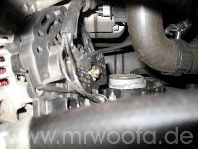 Zuerst wird die Motorhaube geöffnet und die Lichtmaschine lokalisiert, ist wenn man vorm Auto steht links vorm Motor. Die Plastik-Abdeckung des Motors schraubt man mit einem großen (glaube SW 10) Inbusschlüssel ab. Jetzt sollte man auch schonmal die Batterie abklemmen.