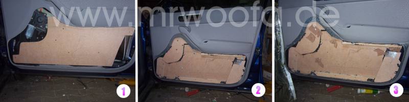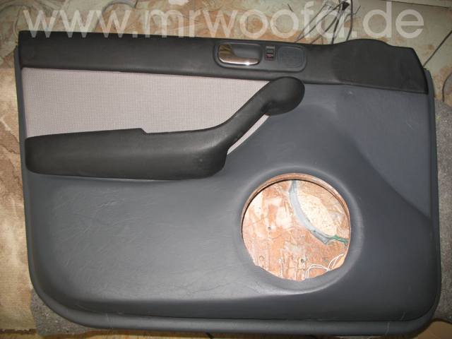 Tjo, in den Audi sollte das gleiche rein wie in den Golf, Visaton GF 200 und AL 130 M, letzterer natürlich angewinkelt. Aufgrund der sehr offenen Trägerstruktur der Tür kam für mich nur ein geschlossenes Doorboard in Frage, und das gleicheProblem wie auch schon im Audi TT ereilte mich: Man kann nur bedingt in die Tür hineinbauen, weil die Verkleidung zum Abbauen etwa 2-3cm angehoben werden muß. Dafür halten die Haken aber auch 10x besser als olle Clipse...