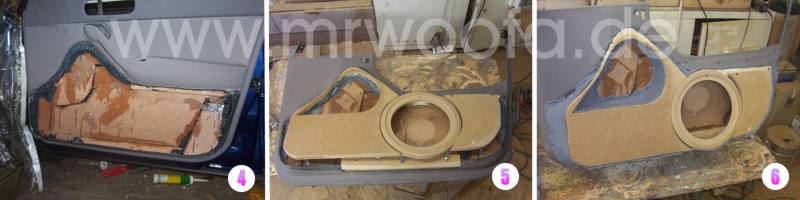 1. Zuerst einmal fängt es wie (fast) jeder Doorboardbau an. Die Verkleidung wird ausgesägt, und eine Grundplatte aus 12mm dickem MDF wird gefertigt und an der Tür verschraubt. Dazu habe ich in den Aggregateträger der Tür mehrere M5-Gewindeblindnieten gepoppt und das Brett nun mittels M5x35er Inbusschrauben befestigt. |