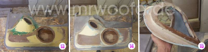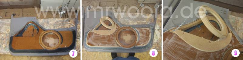 6. Dort wo der Mitteltöner hinkommt lasse ich ein Loch und trenne das Volumen mittels Formvlies vom Baßvolumen ab. Das restliche Board wird dann auch mit Vlies bespannt. |