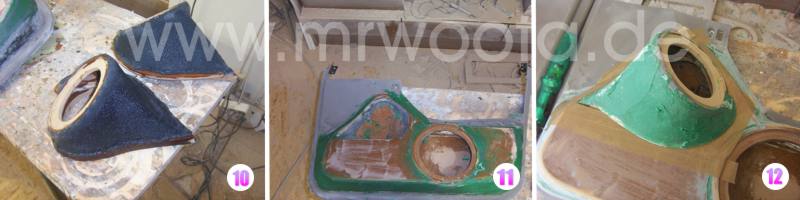 4. Zoom ...und der Freiraum zwischen Grundplatte und Verkleidung mit Formvliesstreifen dichtgemacht, mittels Tacker und Heißkleber hält das. Dann wird das Vlies eingeharzt. Wenns trocken ist ist die Hochzeit vollbracht und die Grundplatte mit der Verkleidung verbunden. |