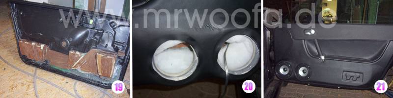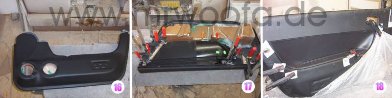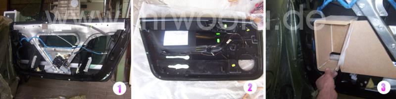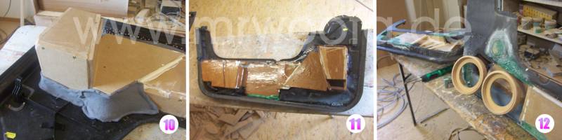 3. Nach langem Grübeln, und auch dem Wunsch, für die beiden Andrian Audio A130 ein geschlossenes Volumen zu realisieren, bin ich dann auf die Lösung gekommen, stückweise ein MDF-Gehäuse in die Tür zu bauen. Hier schonmal das vordere Stück. Immer aufpassen das man die Fenstermechanik nicht blockiert! |