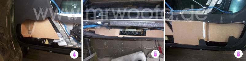 4. Die Verkleidung wird erstmal aus--gesägt, vorher sollte man sich anzeichnen bis wie weit das Handschuhfach im geöffneten Zustand heruntergeht. Hier sieht man den ersten Teil des Gehäuses hinter der Verkleidung, noch lose. |