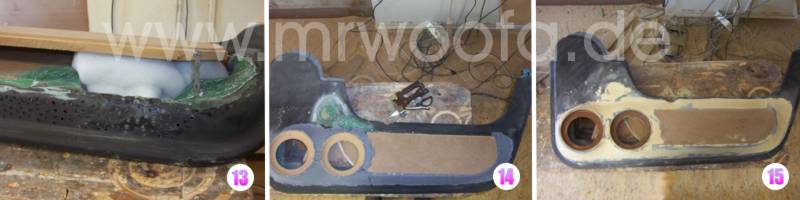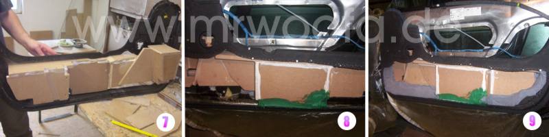 10. Nach dem aushärten wird das Board wieder abgebaut und die restlichen Öffnungen zwischen MDF und Verkleidung werden von hinten ebenfalls mit Formvlies und Harz verschlossen. |