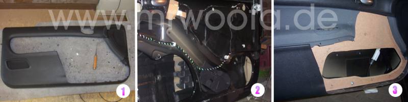 1. Erstmal wird die Türverkleidung entsprechend ausgesägt, drauf zu achtenn ist, das die Kontur der Verleidung, wo es ans Armaturenbrett anschließt erhaltenbleibt, das das später auch paßt. Das Stoffteil was eingesetzt ist ist verschweißt, das bohrt man ganz einfach auf. |