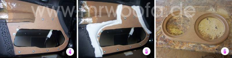 3. Dann wird (am besten macht man sich vorher eine Schablone) eine Grundplatte ausgesägt und am Türblech befestigt. dazu haben wir an 9 später durch die Lautsprecheröffnungen zugänglichen Punkten 6mm Löcher gebohrt, wo Inbusschrauben mit großer Unterlegscheibe und Muttern in der Tür der Sache den nötigen Halt geben. |