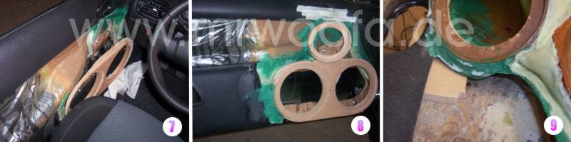 4. Hier sieht man die Positionen der Schruaben sehr gut. Das Stoffteil wird abgekelbt, und provisorisch mit ein paar kurzen Schrauben und großer Unterlegscheibe von hinten wieder befestigt. Das Kunststoff eund um das Doorboard muß mit ganz vielen 4-6mmm Löchern versehen werden damit dort der Spachtel bzw. das Polyesterharz Halt findet. |