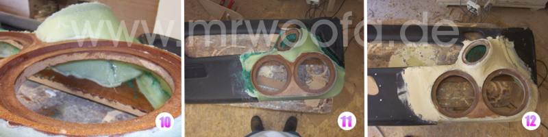 10. Der Mitteltöner muß natürlich einvon den Bässen getrenntes Volumen haben, das geht am einfachsten indem man eine Trennwand aus Formvlies macht und tränkt. Geht auch mit MDF-Stückchen, wird aber mehr Bastelei. |