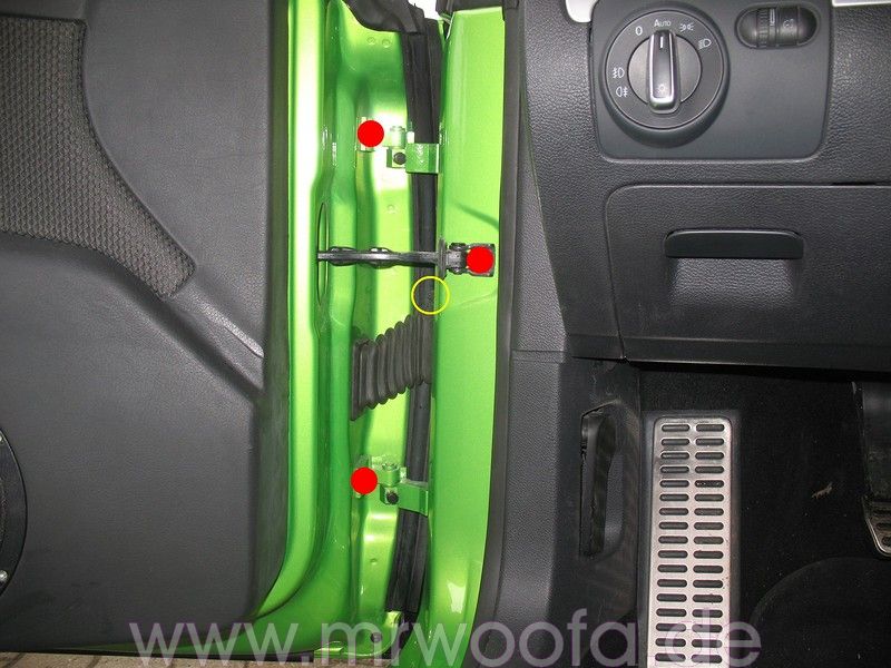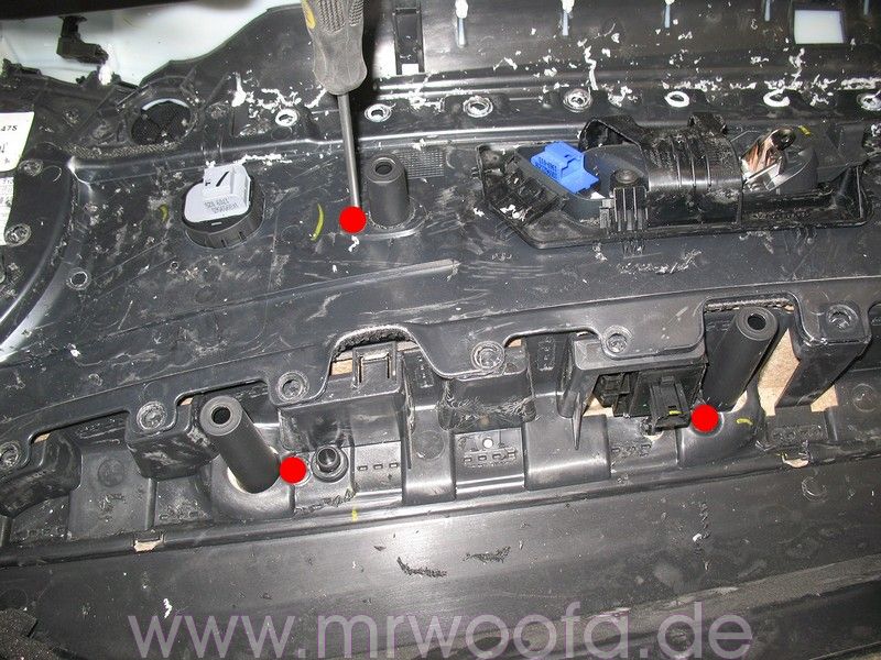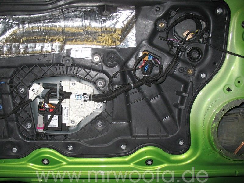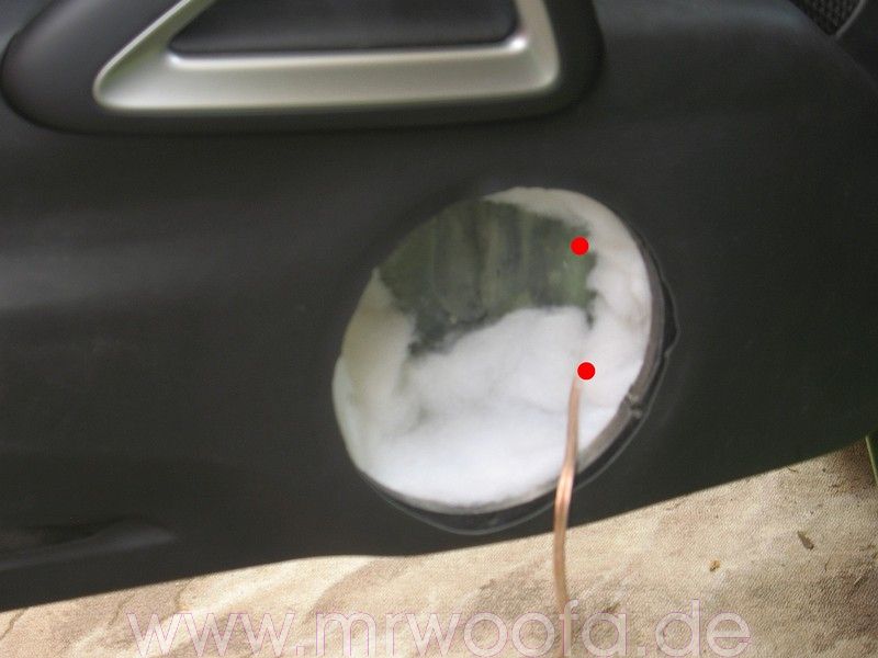 Alles wieder anbauen, Türöffner einhaken und alle Stecker einstecken. Zusätzlich zu den originalen Befestigungspunkten durch Schrauben und Clipse sowie der später vom Inlay verdeckten M6 Schraube werden im Bereich hinter dem Lautsprecher, hier rot markiert, 2 Löcher gebohrt, durch welche 2 weitere M6 Schrauben Halt in zwei ins Türblech gesetzten Einnietmuttern finden. Ist alles verschraubt, füllt man das Board komplett mit Dämpfungsmaterial wie Sonofil auf. Um es in den hinteren Bereich zu bekommen, kann man einen biegsamen Stock einsetzen. In die geschätzten 15l Volumen sollten etwa 3 Matten gefüllt werden.