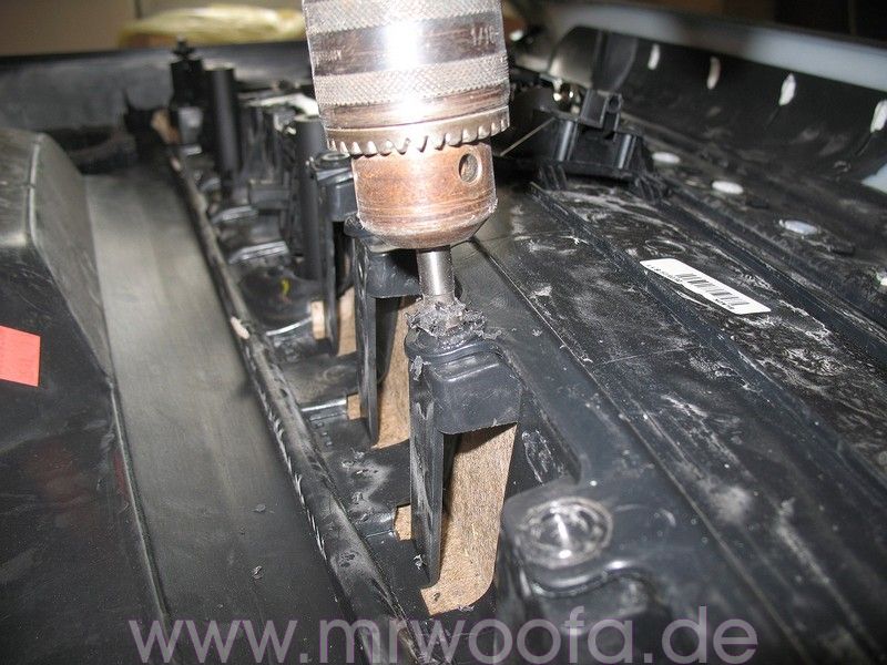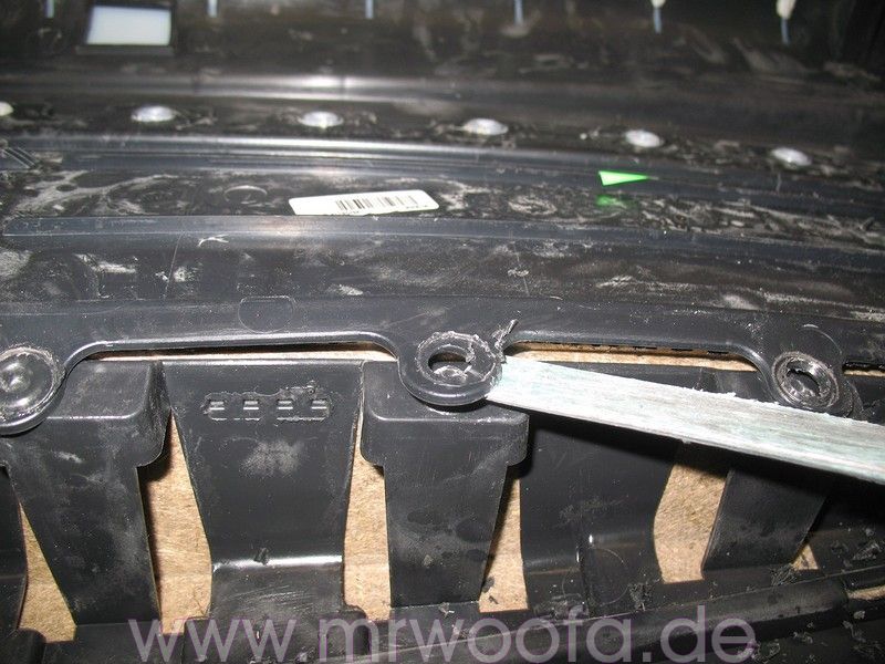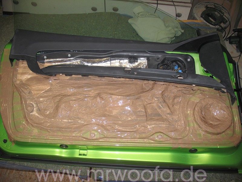 Zuerst wird die Verkleidung wie in den Bildern im Teil ‚Türdämmung’ gezeigt demontiert. Um die Kontur des Aggregateträgers (AGT) gut ablaminieren und das fertige Doorboard später einwandfrei wieder anbauen zu können, müssen die dort verlaufenden Kabel fixiert werden. Hier bietet es sich an, kleine Löcher in die Plastikstreben zu bohren und die Kabel dort mit Kabelbindern zu fixieren. Der Schalter für die Öffnung der Heckklappe kann der Einfachheit halber entfallen (man hat ja noch den Funkschlüssel) und das Kabel im oberen Bereich der Tür aufgerollt festgebunden werden. Wer will, kann ihn auch z.B. in einen freien Platz der Schalterreihe der Mittelkonsole bauen.