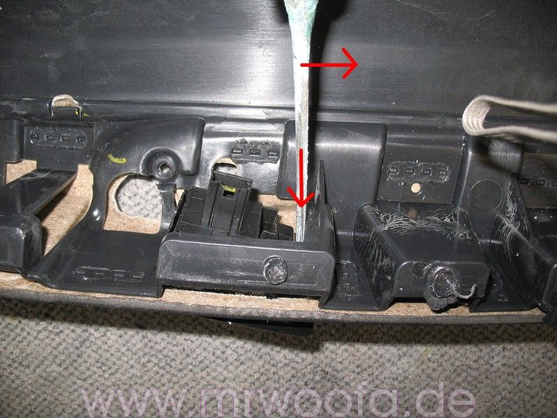 Den Fensterheberschalter kann man leicht ausrasten indem man mit einem Stechbeitel oder breiten Schraubendreher die breiten Rastnasen zur Seite drückt und den Schalter nach vorn aus der TVK herausdrückt.