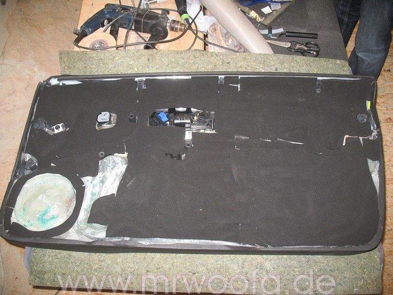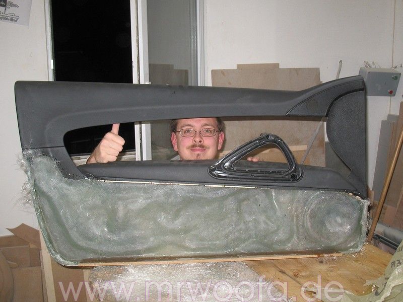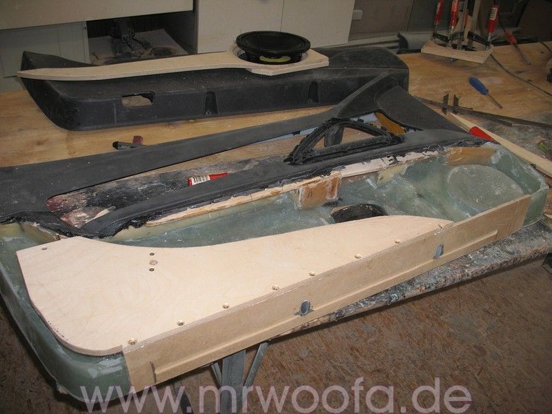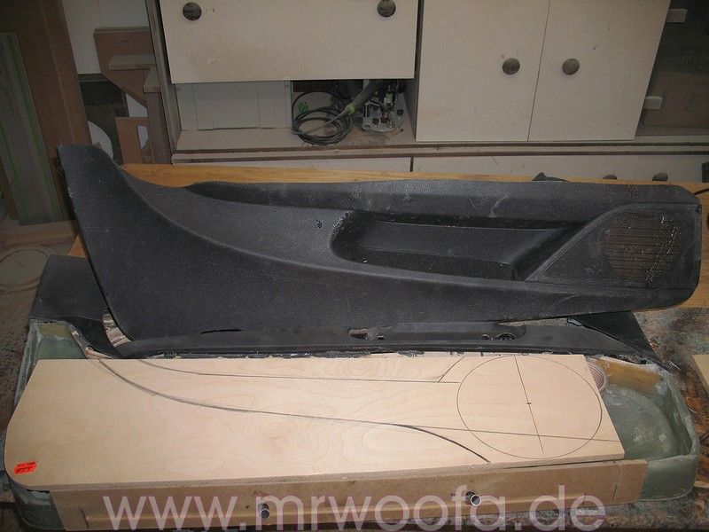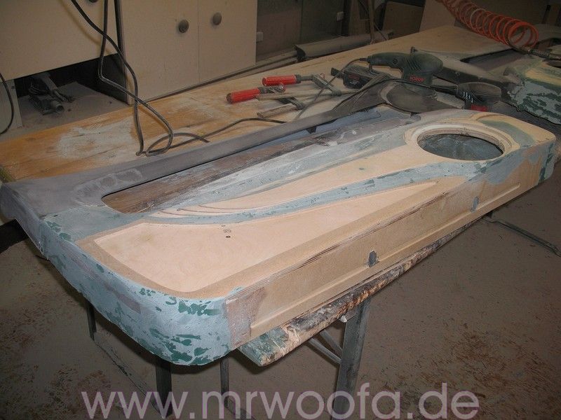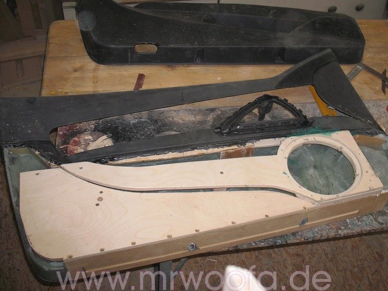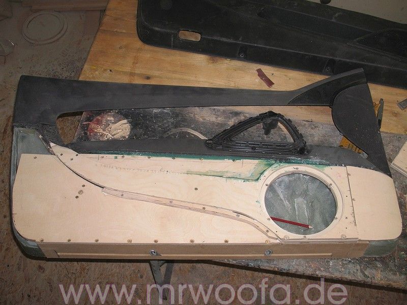 Auf jeden Fall daran denken, das man für die Fensterheberschalter und die dazugehörigen Stecker sowie für den Haltegriff Aussparungen vorsieht! Mindestens im Bereich wo später der Lautsprecher ist sollte man eine vorstehende Kante machen, wo das diesen tragende Brett aufliegt und verschraubt werden kann.