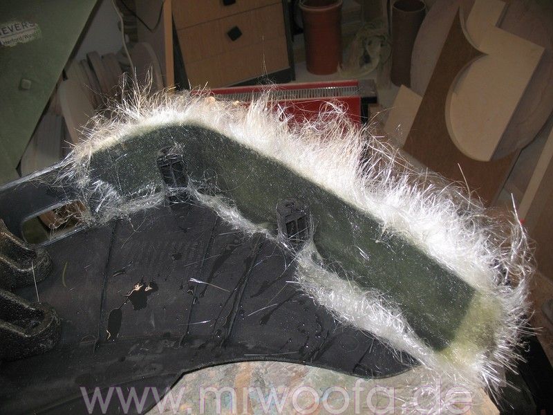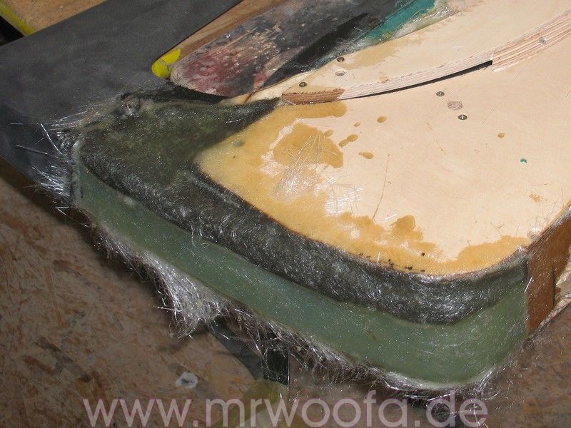 Das Vlies wird mit Harz getränkt, und zur Stabilisierung mit 3 Lagen Glasfasermatten überzogen. Wenn alles fest ist werden GFK und Holz grob mit dem Flex und 40er Schleifscheibe in Form gebracht.