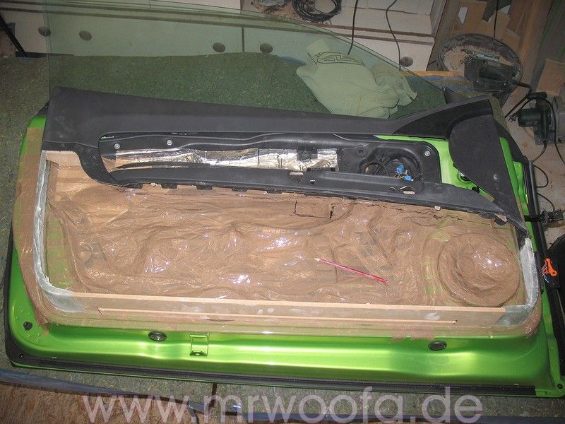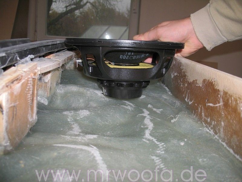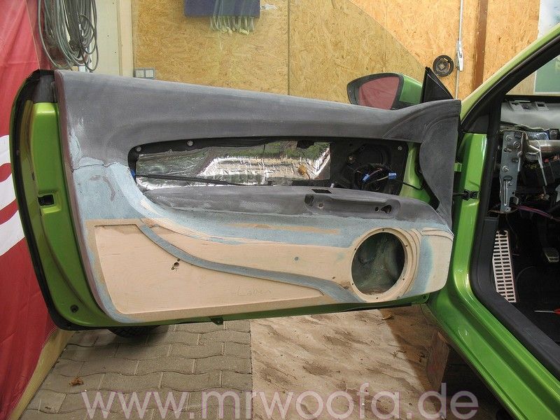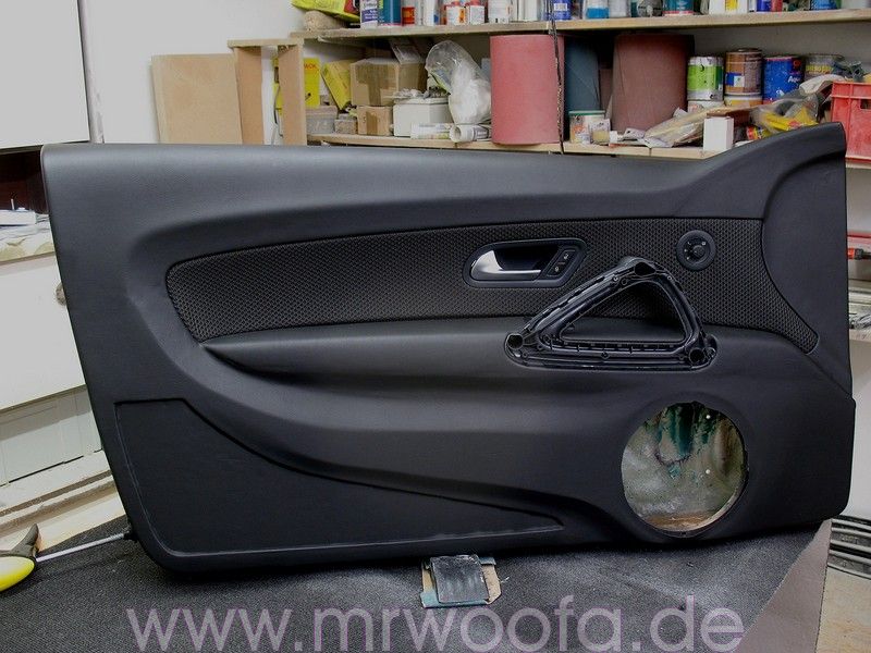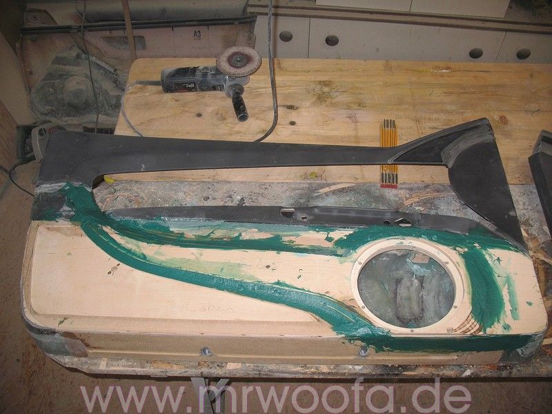Dieser Teil beschreibt den Bau meiner geschlossenen Doorboards. Mit dem richtigen Chassis, welches von den Parametern her mit etwa 10-15 Liter Volumen klarkommt (Qtc <0,7 und fc unter 100Hz), ergibt sich gegenüber dem normalen Verbau auf das Türvolumen der Vorteil, das quasi nichts mehr zum Klappern angeregt wird, ggf. kann sogar die Türdämmung auf eine Lage reduziert werden, da der Schall das Türblech deutlich weniger anregt. Weiterer positiver Aspekt ist, dass man außerhalb des Fahrzeugs fast gar nichts mehr von der Musik hört. Der Aufbau sieht grob so aus, das die Verkleidung ausgeschnitten, die Kontur der Tür mit Polyesterharz und Glasfasermatten (GFK) ablaminiert wird, und dann mittels Holz und GFK die Aufnahme für den Lautsprecher und der ‚Deckel’ des Gehäuses gebaut wird. Anzumerken ist noch, dass das hier keine ‚Wochenend-Aktion’ ist, sondern sicherlich 5-6 komplette Tage in Anspruch nimmt.
