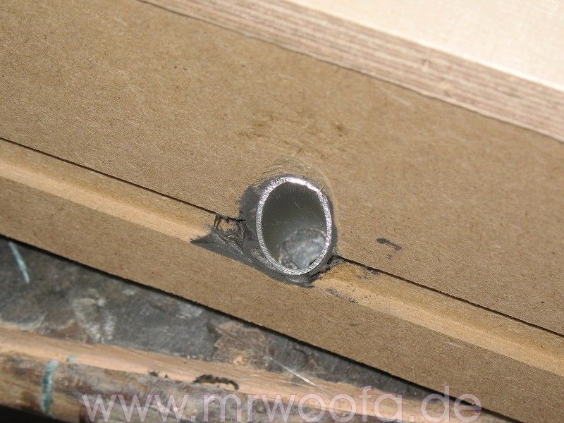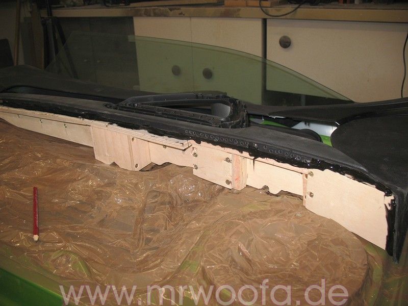 Nun kann man an den Stellen wo die originale TVK festgeschraubt war 2 Löcher ins GFK bohren und schräg durch die Holzplatte 2 Aluröhrchen einsetzen, so dass man von unten das Board an den 2 Punkten befestigen kann. Mit Karosseriekleber wird alles schön abgedichtet.