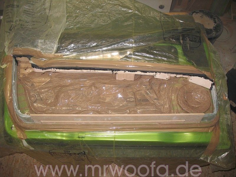 Die abgebaute Tür legt man auf einen vorher präparierten Tisch, am unteren Ende der Scheibe legt man ein dickes Kantholz um keinen Druck auf den Spiegel auszuüben. Darüber mit Decken oder weichen Dämmmatten gut polstern das dem Türblech nichts passiert. Jetzt muss die gesamte Fläche die laminiert werden soll möglichst faltenfrei abgeklebt werden, empfehlen tut sich dazu das ganz billige braune Paketband vom Baumarkt, was gerade eben so klebt. Es ist schön dünn, passt sich somit den Konturen gut an und wenn das Harz daran doch mal besser haftet, geht es vom Untergrund los so dass man mit dem Ablösen des Laminats keine Probleme bekommt.