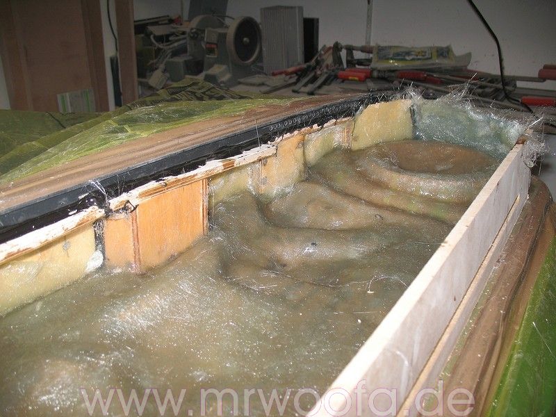 Um an den Enden sanfte Übergänge zu bekommen, bietet es sich an, vom ‚Grundträger’ zu den Rändern hin mit Formvlies zu bespannen. Hier wird es genutzt um am hinteren Ende einen schönen Übergang vom hohen Board zur niedrigeren TVK zu bekommen. Auch hier nochmal der Hinweis, das das Kunststoff des unteren Verkleidungsteils im Gegensatz zum Bild komplett entfernt werden muß weil dort kein GFK hält.