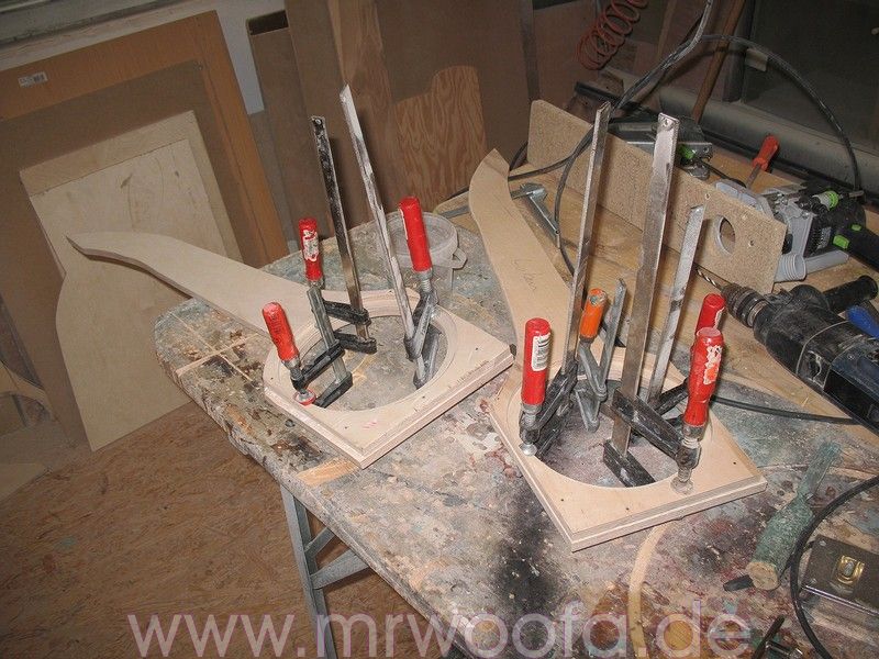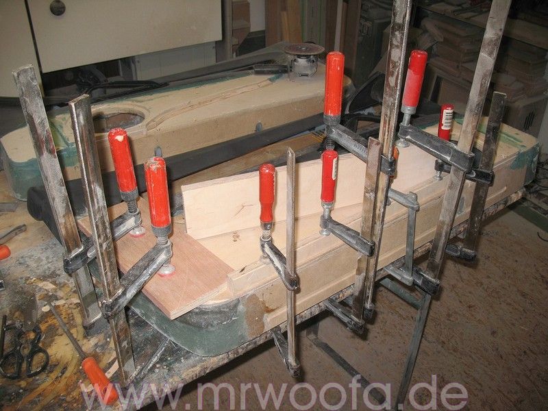 Passt alles, kann man die gewünschte Form aussägen und Löcher für das Chassis fräsen, hier wird gerade die Auflagefläche des Chassis mit der Front verleimt.