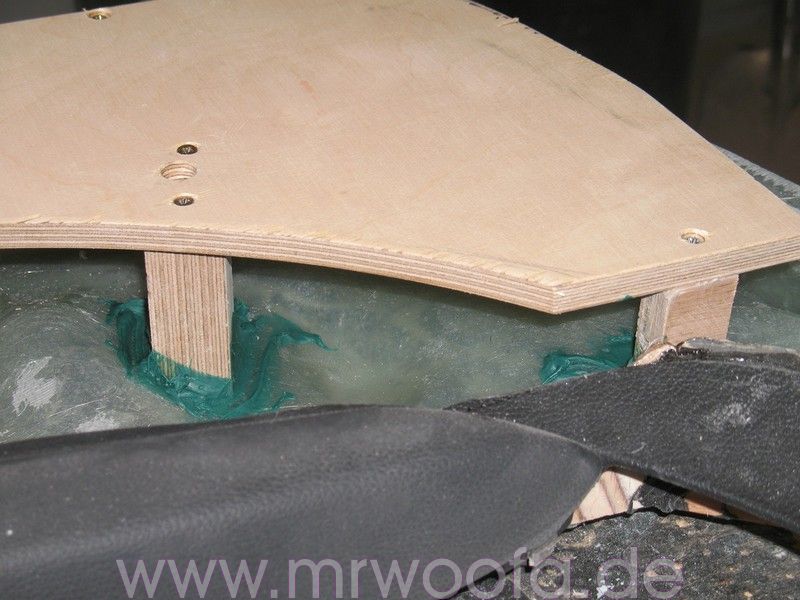 Hier sieht man die Stützen für das Brett. Durch Stützen bekommt das Board eine viel größere Stabilität. Holz auf Holz wird mit Holzleim verklebt und mit Schrauben fixiert, unten auf dem GFK sorgt ein Klecks Glasfaserspachtel für Ausgleich von Unebenheiten und eine steife Verbindung. Besonderheit ist die im Bild linke Stütze. Sie ist massiver und mittig mit 7mm durchbohrt, sowie in der Deckplatte ein größeres Loch um einen Schraubenkopf aufzunehmen. An dieser Stelle wird das Board mit einer langen M6-Inbusschraube an die Tür verschraubt. Setzt man dies noch etwas weiter außen als ich das hier gemacht habe kann die Einnietmutter statt ins Plastik direkt ins Türblech gesetzt werden für maximalen Halt.