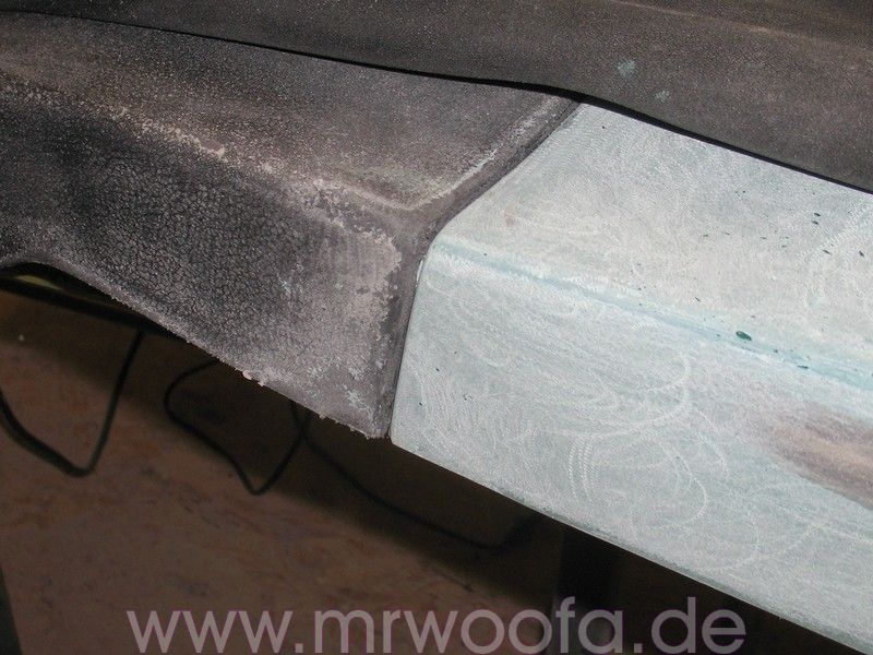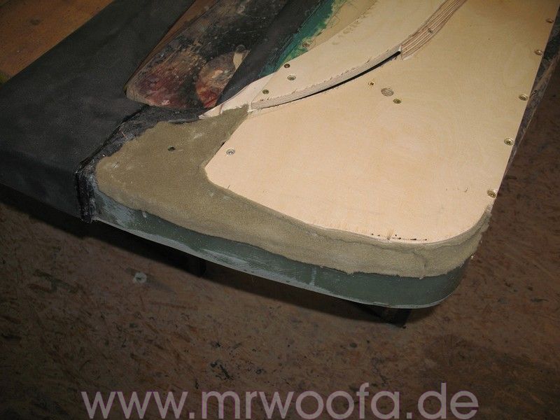 So sollte (im Gegensatz zum vorigen Bild) der Übergang vom Doorboard zum oberen Teil der originalen Verkleidung aussehen. Nirgendwo dünn über das Kunststoff spachteln, nach Möglichkeit den Bezug des oberen TVK-Teils nicht durchschleifen, und eine Nut lassen wo der Übergang Board – TVK arbeiten kann.