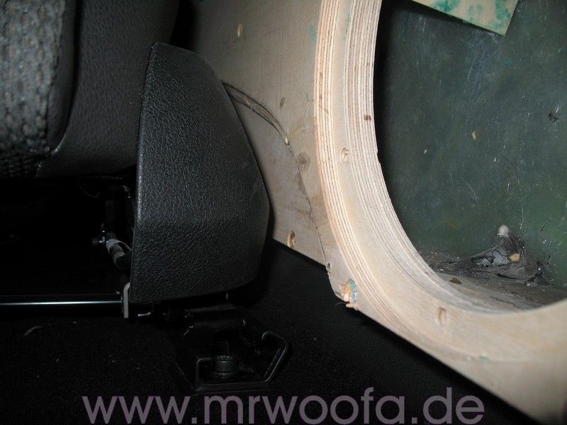Jetzt schneidet man sich die ablaminierten Ecken des unteren TVK-Teils zurecht und ein Brett welches den unteren Rand darstellt. Hier vorher den Abstand vom Türblech zum Sitz messen, damit es später auch passt! In das Brett habe ich hier eine Nut gefräst, die später eine LED-Ausstiegsbeleuchtung aufnimmt.